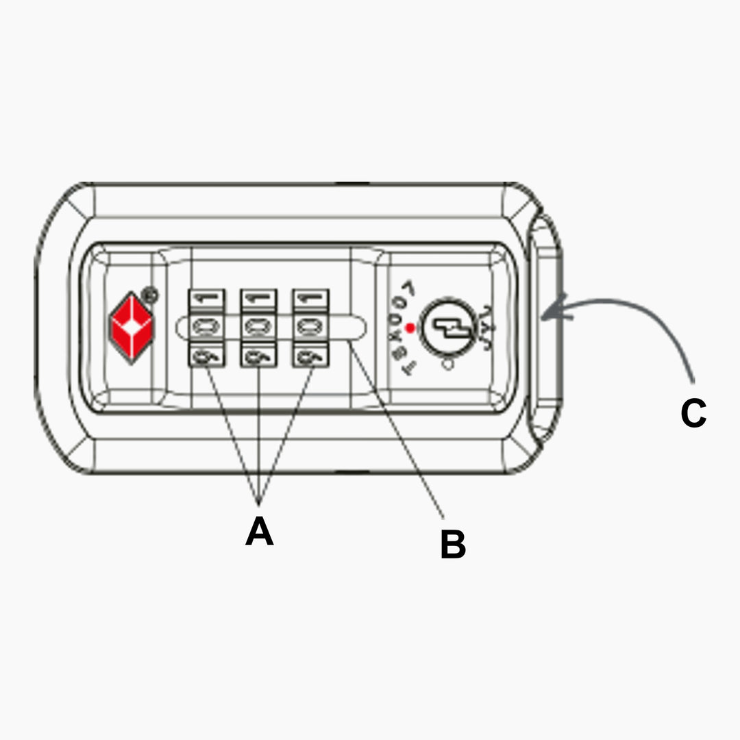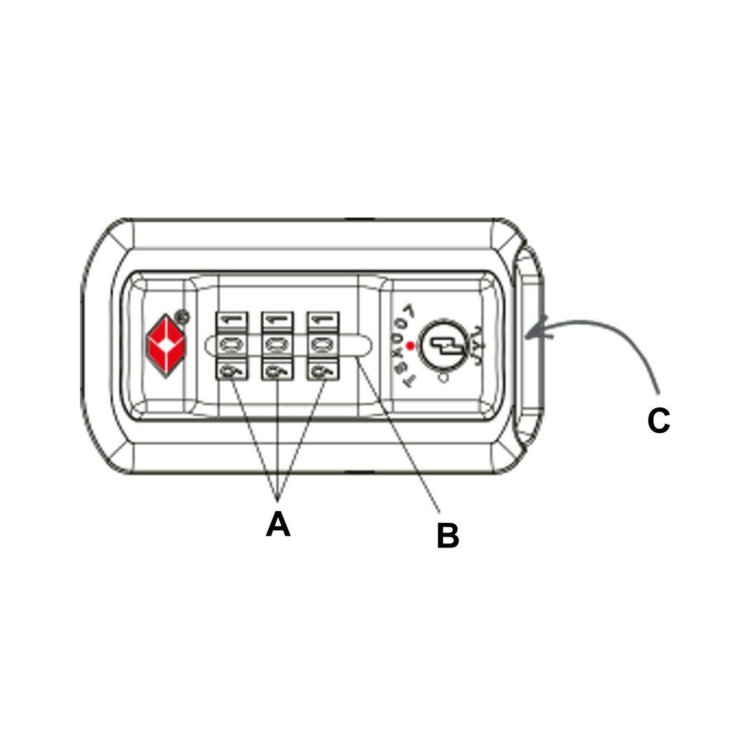 Użyj pokręteł oznaczonych literą A i Zestaw je do kombinacji według własnego wyboru. Gdy Zestaw swoją kombinację, upewnij się, że pokrętła są całkowicie wyrównane, korzystając z linii oznaczonej literą B.