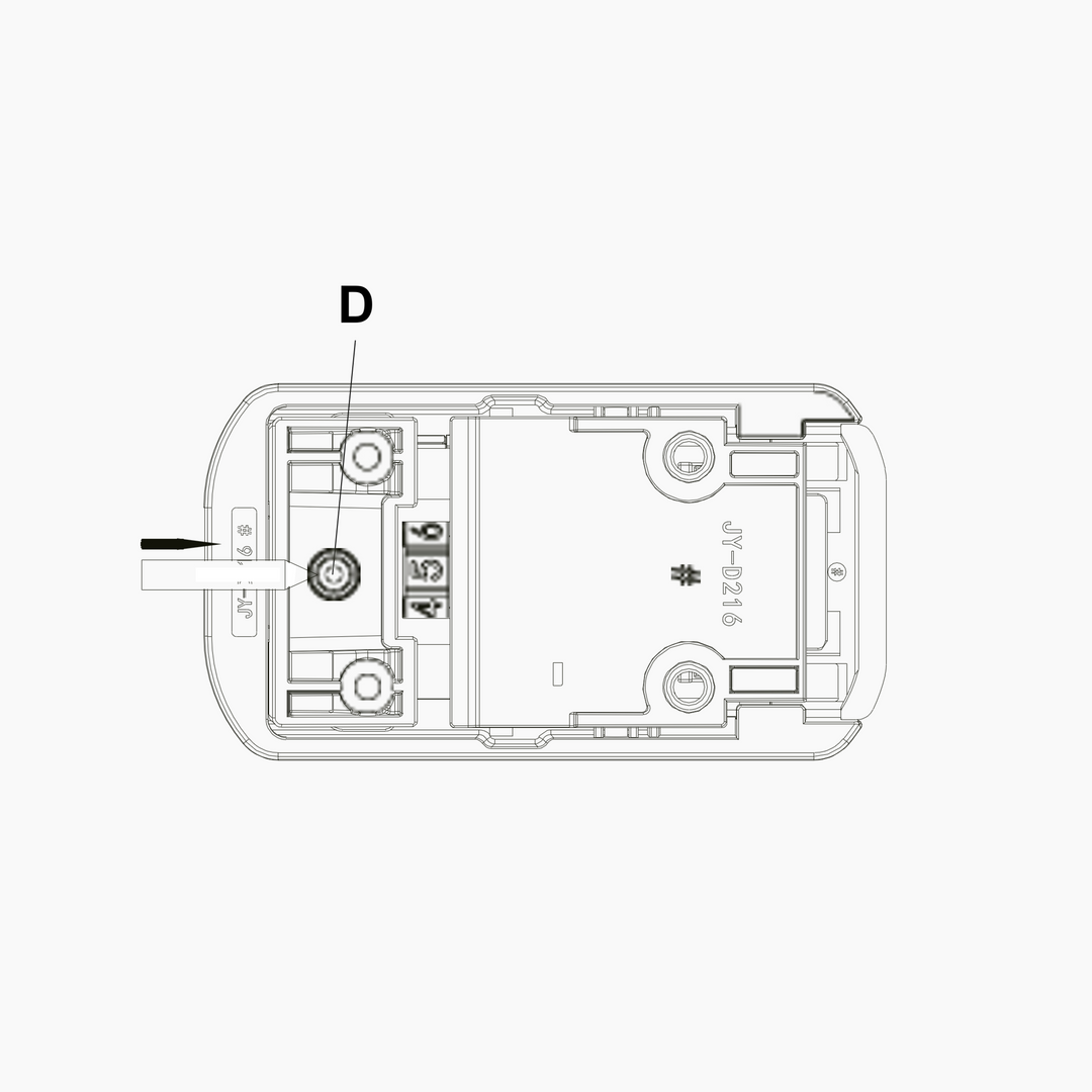 Aby zainicjować zmianę kombinacji zamka, należy najpierw nacisnąć przycisk resetowania - oznaczony literą D. Przycisk znajduje się na tylnej stronie zamka i jest widoczny tylko wtedy, gdy zamek jest otwarty.